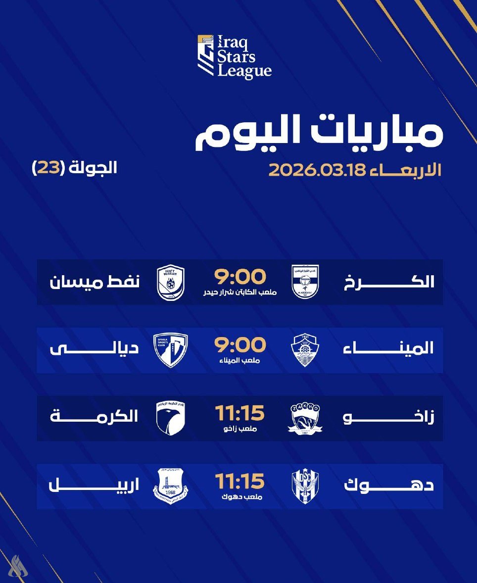 تقام مساء اليوم الأربعاء، أربع مواجهات في غاية الأهمية ضمن منافسات الجولة الـ23 من دوري نجوم العراق لكرة القدم، إذ تنطلق صافرة البداية عند الساعة التاسعة مساءً، حين يستضيف نادي الكرخ نظيره نفط ميسان على ملعب الكابتن شرار حيدر، في لقاء يسعى فيه الطرفان لتعزيز موقعهما وحصد نقاط ثمينة. وفي التوقيت ذاته، يفتتح نادي الميناء أبوابه لمواجهة ديالى.