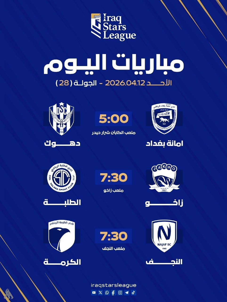 تنطلق اليوم الأحد منافسات الجولة الـ28 من دوري نجوم العراق لكرة القدم للمحترفين، بإقامة ثلاث مباريات تجمع فرقاً تسعى لتحسين مواقعها في لائحة الترتيب، حيث يستضيف في تمام الساعة الخامسة عصراً ملعب الكابتن شرار حيدر، لقاء أمانة بغداد وضيفه دهوك.